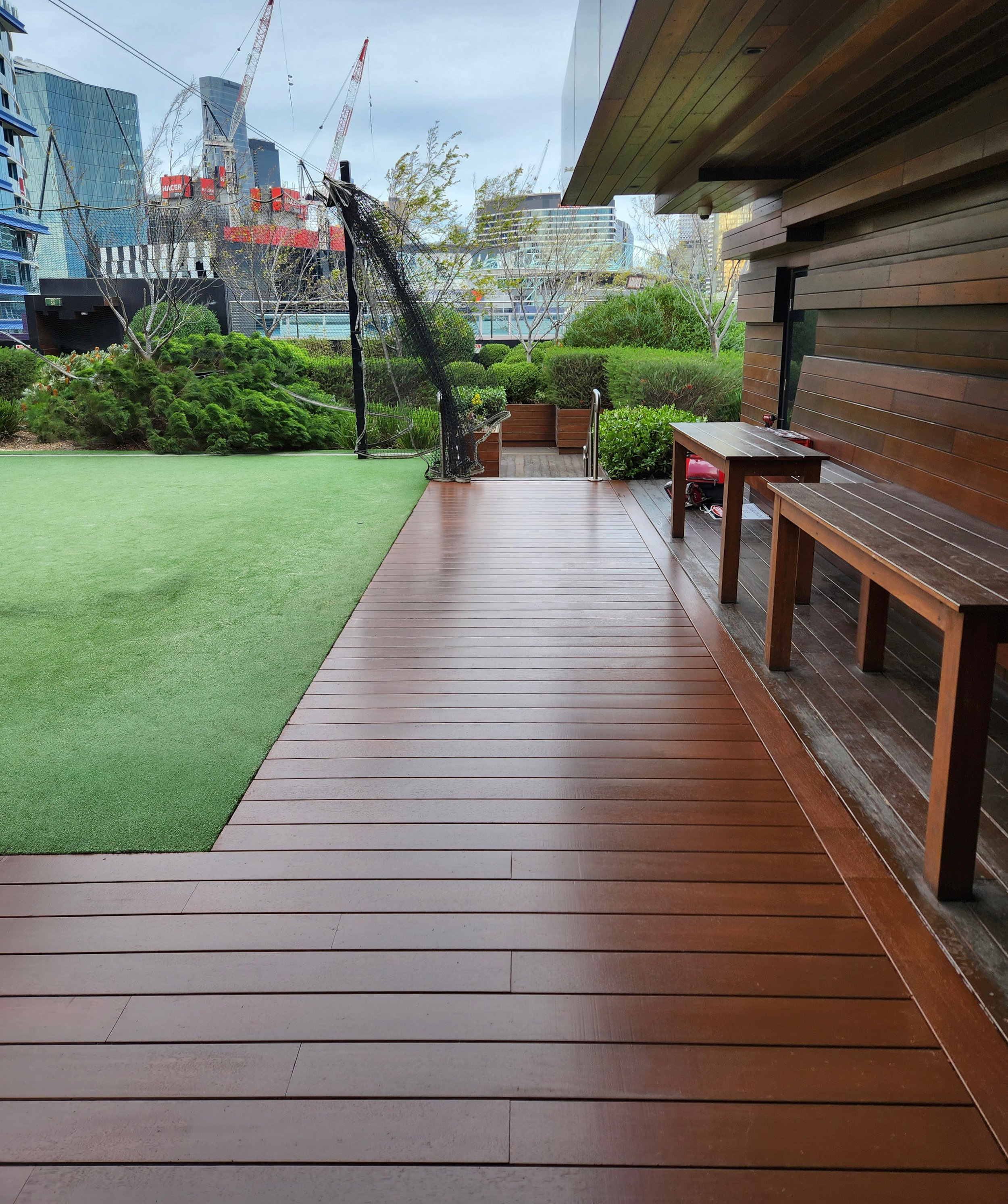 This 7th-floor apartment deck was transformed into a sophisticated outdoor area. Designed to maximise stunning city views and features durable timber decking. This elevated deck combines functionality and style in the heart of the city.